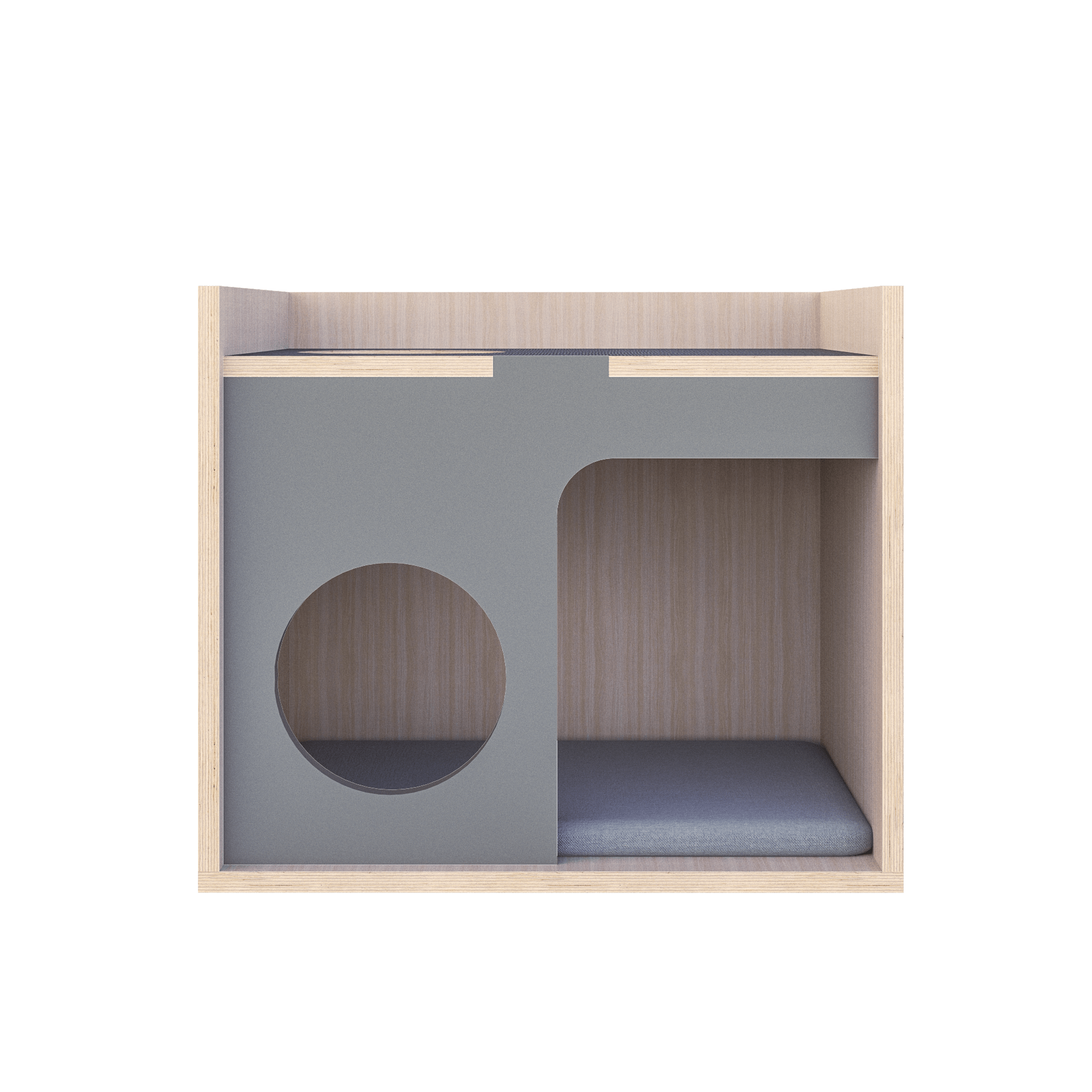 Diseñada especialmente para felinos, esta casa combina perfectamente función y estética. Con un orificio frontal y uno superior, así como un área de rascador, la casa Kai será el sitio favorito de tu gato.